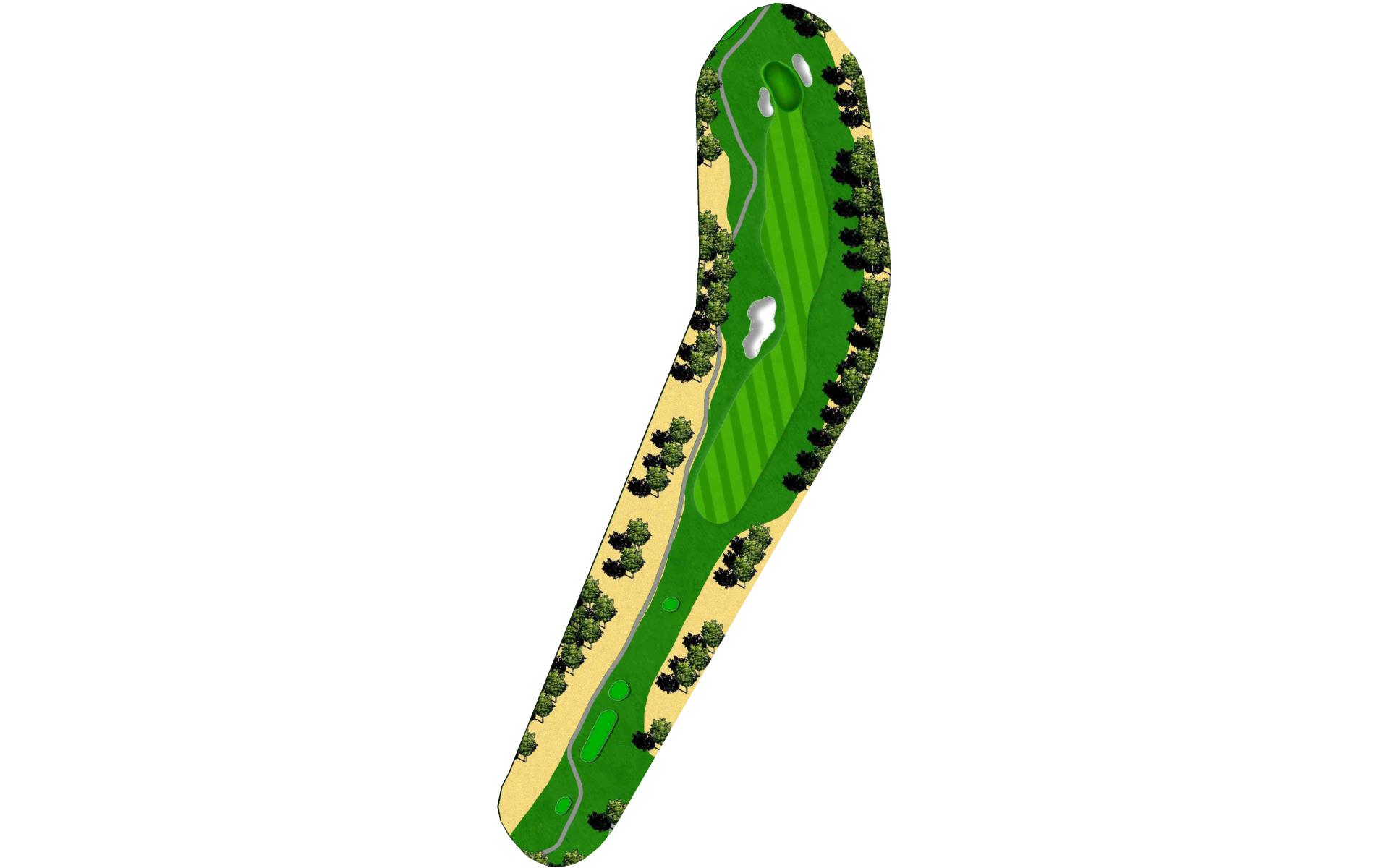 A dogleg left with a fairway bunker guarding the left corner. An accurate second shot will give an easier approach to the elevated two-level green. Aim left of the fairway to avoid the mounds on the right.